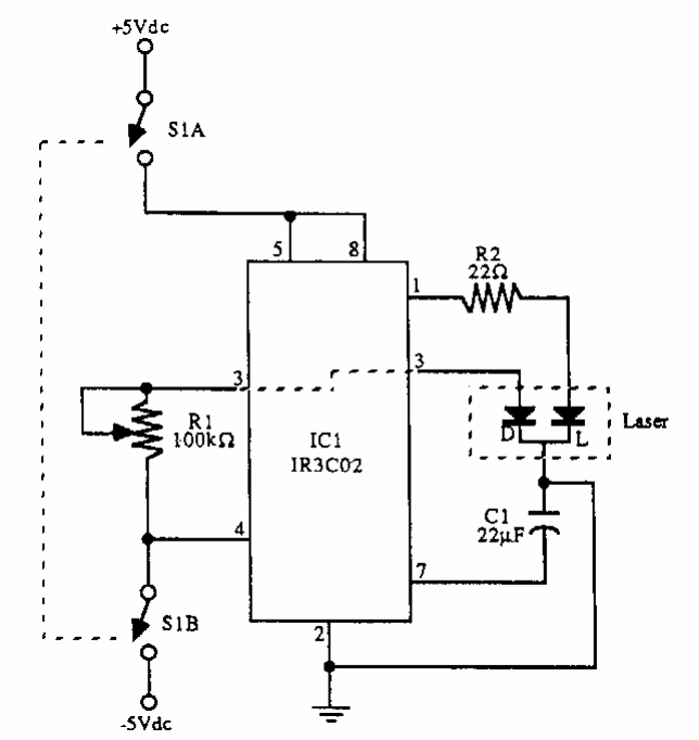 Found in American documentation from the 1990s, this simple circuit excites a LASER diode. The integrated circuit is from Sharp, uncommon nowadays.
