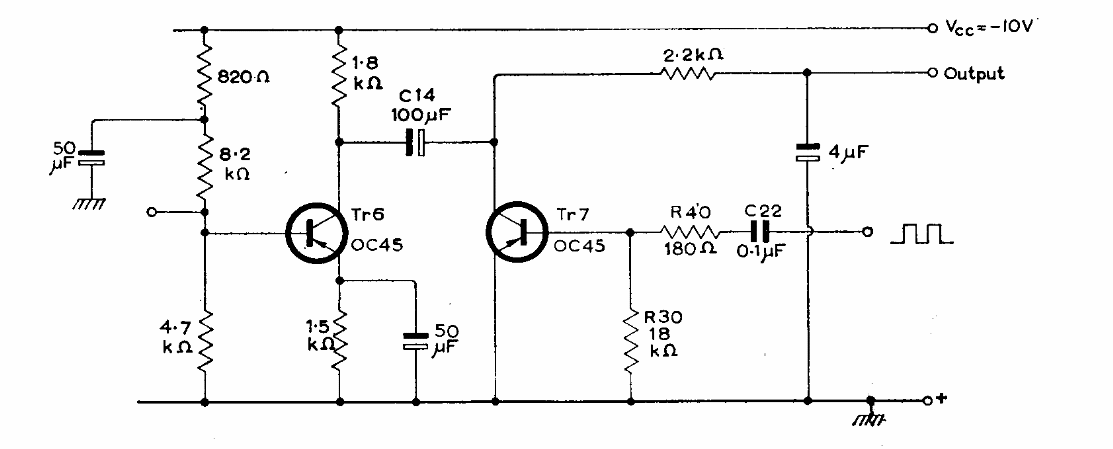 This circuit was found in Mullard's 1960s transistor manual. The circuit employs contemporary germanium transistors and operates at 1.65 kHz.