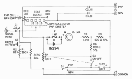 This transistor tester was found in a publication by Gernsback from 1960. The circuit can be used with current transistors.