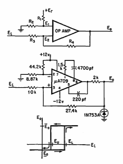 Suggested by an American documentation from the 1960s, this circuit provides an operational hysteresis amplifier, according to the curve given in the diagram.