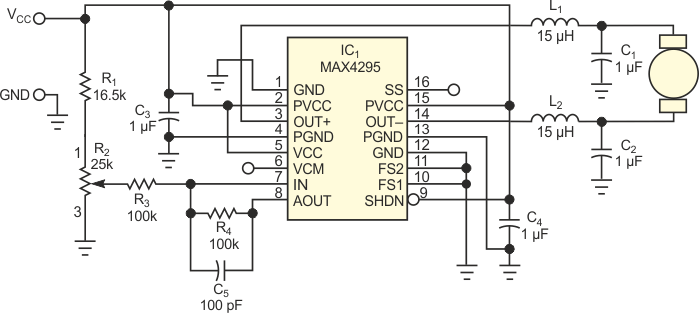 Based on Maxim documentation, this circuit can control a motor using a MAX295 class D audio integrated circuit. The motor can power a maximum current of a few amps. See the MAX4295 datasheet for more information.