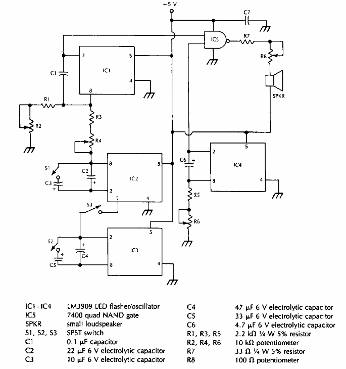 Using LM3909 integrated circuits, this circuit was found in an American documentation from the 90's. The frequencies can be changed by changing the capacitors.