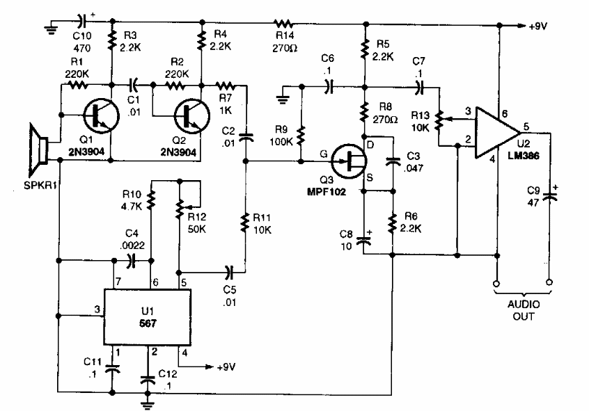 This circuit was found in a Popular Electronics from the 90's. The output signal can be applied to a headphone or speaker. The microphone can be a piezoelectric tweeter capsule or other type.