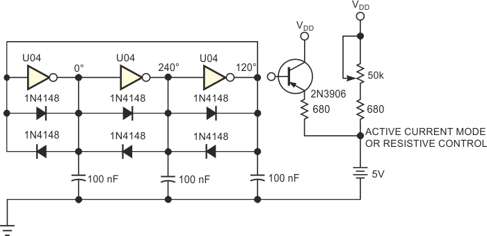 Based on 74HC digital circuits, this circuit generates signals in three phases. The frequency depends on the capacitors and the transistor is a general-purpose type. The oscillation point is set on the potentiometer.
