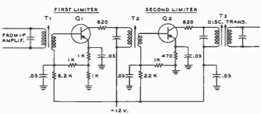 Found in a 1977 documentation, this circuit is intended to remove amplitude variations from a frequency-modulated signal. The components are frequency dependent.