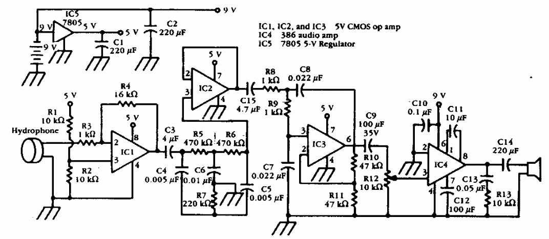 This circuit allows the listening of undersea sounds using a special transducer. Operational amplifiers can be of any type. The circuit was found in a Popular Electronics from the 90s.