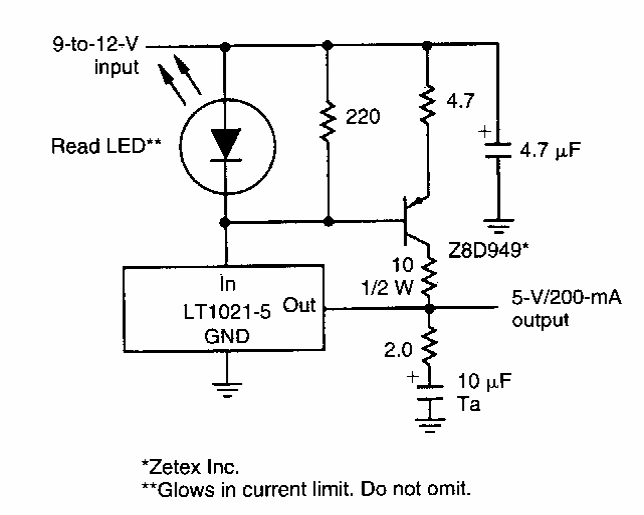 This power supply was obtained from an Electronic Design from the 90's. The circuit applies to other 3-terminal regulators. The maximum output current is 200 mA.