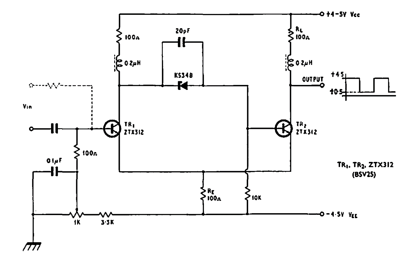 This Schmitt trigger was found in a 1969 Ferranti documentation. Transistors may be modern equivalents.