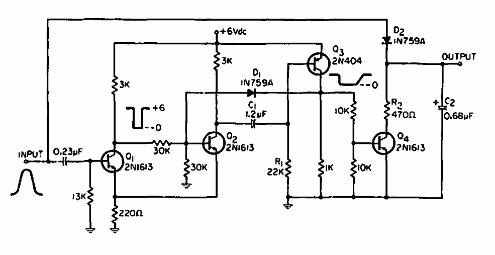 We found this circuit in an American documentation from the 60s. The circuit can be made with equivalent transistors. It basically consists of a monostable.