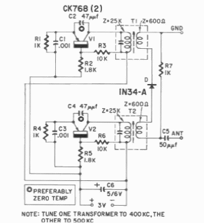 This circuit produces signals with harmonics for 600, 700, 800 kHz allowing the calibration of shortwave receivers. The circuit is from a 1960 Gernsback documentation.