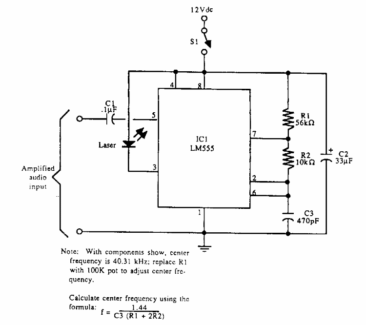 This modulator circuit was found in an American documentation from the 90's. The circuit uses a low power LASER diode. Power is supplied with 12 V.