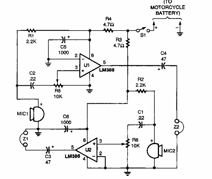 Found in a Popular Electronics from the 90s, this circuit is suitable for communication between rider and pillion. The circuit makes use of an integrated audio amplifier that can be replaced by a modern equivalent.