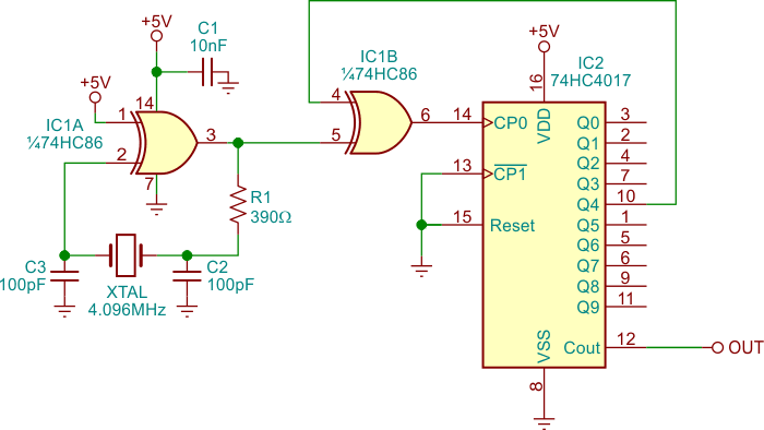 This 455 kHz IF calibration circuit uses a 4,096 MHz crystal. The circuit can be powered by voltages from 5 to 9 V.