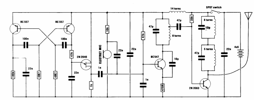 This circuit was found in an Australian publication from 1991. The circuit emits a tone as well as the picked up sound when triggered.