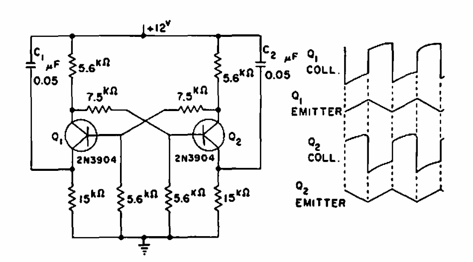 Found in a 1968 publication, this circuit generates signals with the waveforms shown next to the diagram. Modern equivalent transistors can be used.