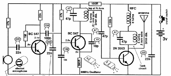 We found this small FM transmitter in an Australian publication from 1991. The 3-transistor circuit has a range on the order of 400 meters.