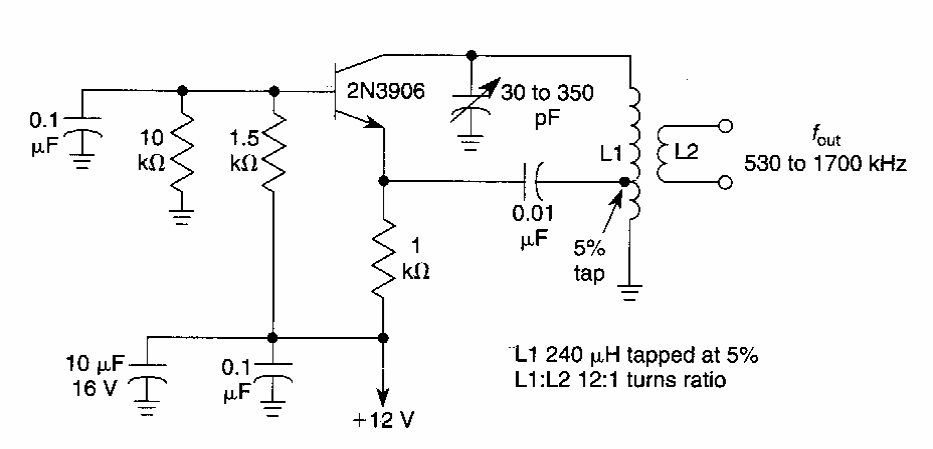 This ground-based circuit was found in 1990s American documentation. The transistor can be any general-purpose equivalent.