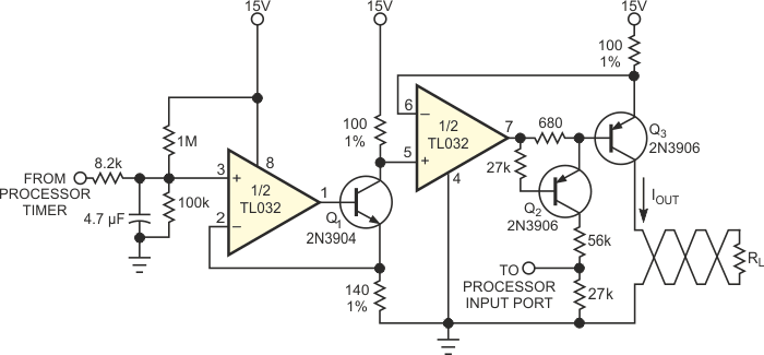 The basis of this circuit is the TL032 from Texas Instruments. The circuit converts an input in this range into voltages that can be transmitted from sensors. The circuit allows the use of twisted pair.