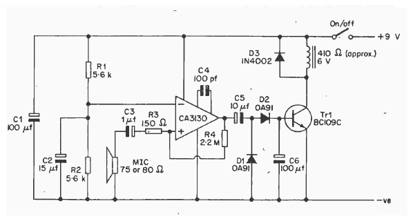Using a CA3130, operational amplifier with FET, we found this circuit in a 1977 publication. The microphone is a high impedance speaker. The power supply is according to the relay voltage.