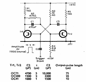 This circuit with germanium transistors was found in a Mullard manual from 1960. The components depend on the transistors, as shown in the table next to the diagram.