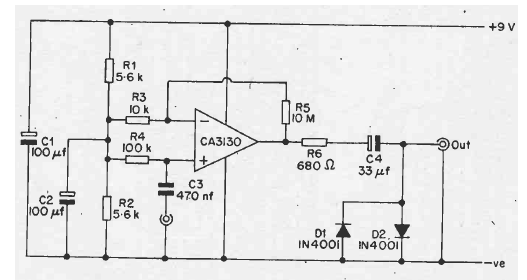 Using a CA3130 operational amplifier, this circuit from a 1977 documentation can handle low frequency signals and does not need a symmetric power source.