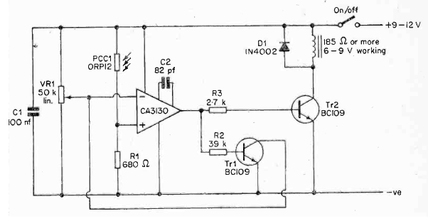 This circuit uses a feedback system that latches the relay when closed. The circuit uses an operational with FET CA3130 and the transistors can be the BC548.