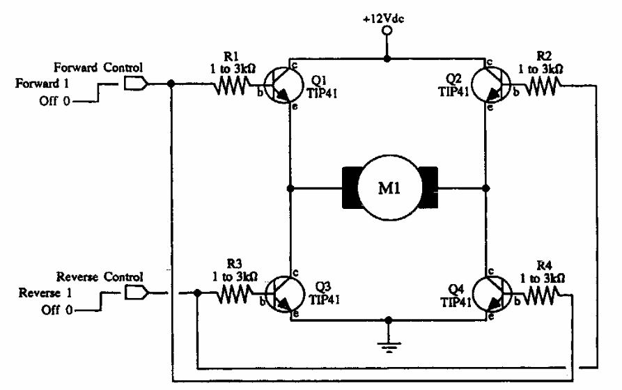 This circuit was taken from old American documentation. The transistors used make it possible to control a motor with up to 2 A of current. They must be equipped with heat sinks.