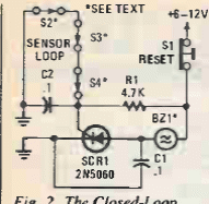 This SCR circuit activates a buzzer when triggered. The circuit is from a Popular Electronics from 1992. Remember the voltage drop across the SCR while driving.