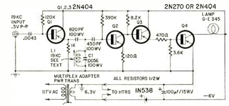 This circuit was found in a Radio Electronics magazine from August 1963. The transistors are contemporary types, and the indicator is a common incandescent lamp. The circuit is excited by the signal from the receiver's IF amplification stages.