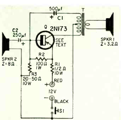 This circuit was found in a Radio Electronics from May 1965. The transistor is a power transistor and in the original design it uses the metal case as a heatsink. The circuit operates with two speakers.