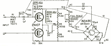 This circuit for an isolated instrument or multimeter can increase the sensitivity of your instrument to 200,000 ohms per volt. We found it in a Radio Electronics from October 1962.
