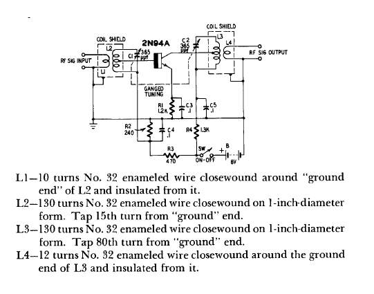 This mid-frequency amplifier circuit was found in an American publication from the 1950's. The transistor is from the time and data on the coils are provided.