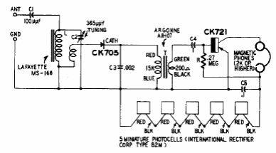 This simple 60's receiver is powered by solar cells of the time. The transistor is made of germanium and the headphones must be high impedance.