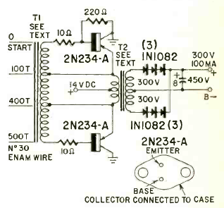 This power inverter circuit was found in Radio Electronics magazine from December 1959. Transistors are types of the time that must be equipped with heat sinks.