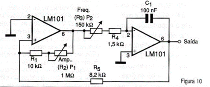 National Semiconductor suggests the circuit in the figure, which uses two LM101 operational amplifiers. The output waveform is triangular, adjusted in shape by trimpot P1. The 150k ohm trimpot P2 adjusts the oscillator frequency, which also depends on capacitor C1. The maximum operating frequency of this circuit is around 1MHz, and the power supply must be symmetrical.
