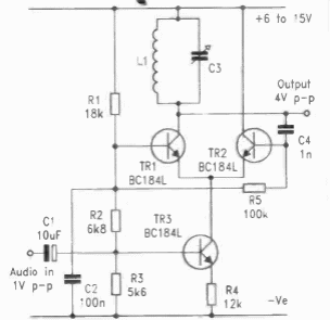 This circuit is a variation of the previous one, containing a modulation input. The components are the same. Transistors support equivalents.