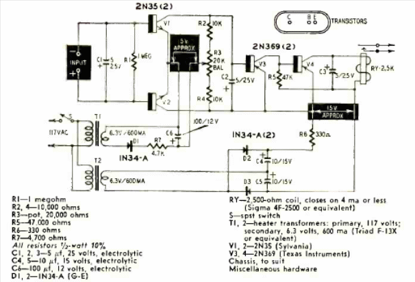 This relay drive circuit was found in the July 1958 Radio Electronics magazine. The transistors are of the time and the relay is the 9V sensitive type.