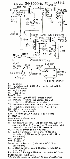 This reflex radio for medium waves and headphone listening was found in Radio Electronics magazine from July 1960. Power comes from a 4 V battery.