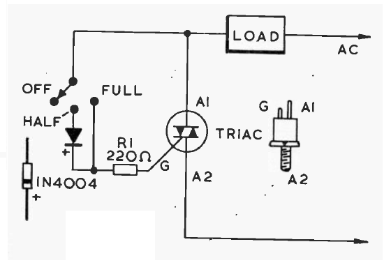 This light control for triac incandescent lamps can be seen elsewhere on this site. This version is from an English publication from the 90's. The Triac can be any of the TIC series.