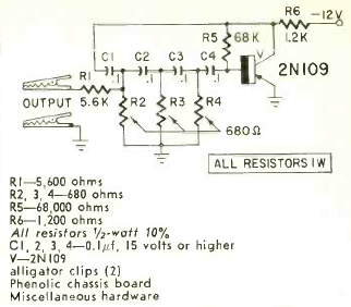 This phase-shift oscillator with a transistor generates sinusoidal signals in the audio range. The circuit was published in Radio Electronics magazine in December 1959.