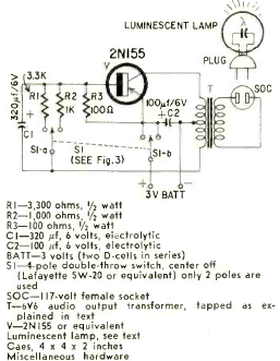 This battery-powered emergency light circuit was published in an April 1962 Radio Electronics magazine. The luminescent lamp is a low-energy type using gas.