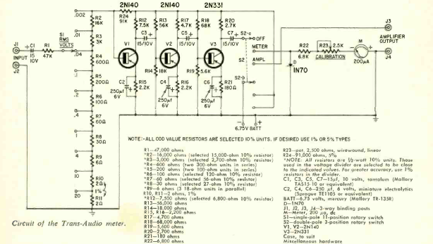 The assembly of this circuit with 3 transistors was described in an article in Radio Electronics magazine from February 1963. Note the different scales depending on the range of measured signal intensities.