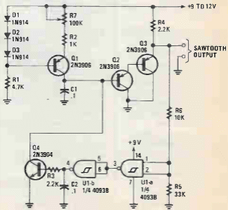 This circuit generates approximately 30 Hz signals from a 3.3 kHz clock. The circuit was found at Popular Electronics in 1992. Transistors support equivalents.