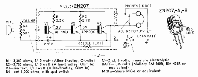 This three-transistor circuit was found in Radio Electronics magazine from May 1969. The circuit is for hearing aids and has earphone listening.