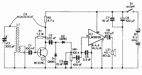 With an amplifier stage with the LM380, this circuit has excellent sensitivity powering a loudspeaker. The coil is the same as in the previous design.