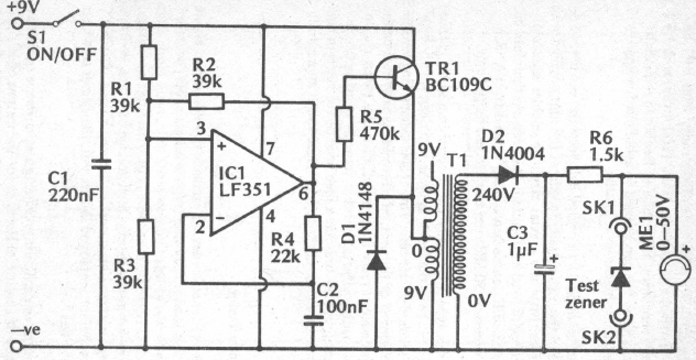 This zener test circuit was found in an English publication from 1989. The circuit tests zener up to 50V using a voltage inverter with a common transformer. The transistor is a general-purpose type.