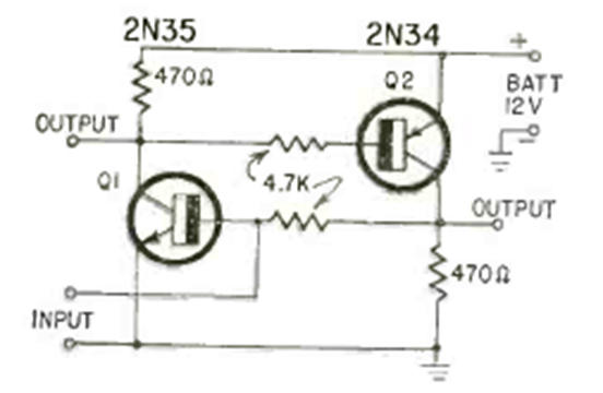 This oscillator circuit with two transistors is from a 1965 documentation. The circuit is of the bistable type operating with an external synchronization signal.