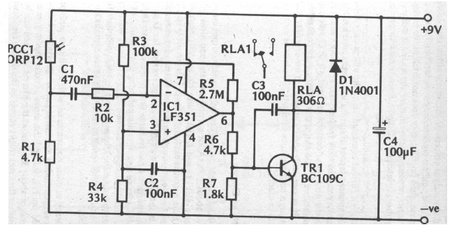 This photoelectric sensor that triggers a relay was found in an English book from 1989. The transistor is a general-purpose type, and the integrated circuit consists of an operational amplifier.