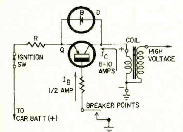 This switching circuit for contact breaker cars was found in a Radio Electronics from April 1964. The circuit can use any transistor of the time and the resistors depend on their characteristics. Typical values for R are between 2.2 and 10 ohms and for the base resistor between 47 ohms and 470 ohms.
