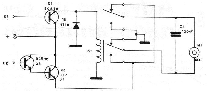This simple circuit from a 1987 documentation can be used in robotics and automation, as well as being controlled by microcontrollers such as Power Shield. The relay is 5 to 12 V depending on the type of control and for best performance 1k resistors must be connected in series with the bases of the transistors. The control functions are: